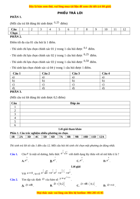 Phần 1. Câu trắc nghiệm nhiều phương án chọn. 1B 2A 3D 4C 5D 6D 7A 8B 9B 10D 11D 12A