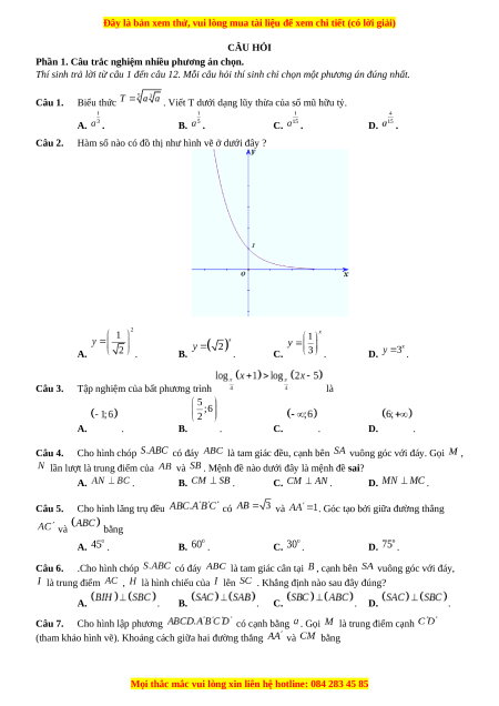 Thí sinh trả lời từ câu 1 đến câu 12. Mỗi câu hỏi thí sinh chỉ chọn một phương án đúng nhất. Câu 1. Biểu thức