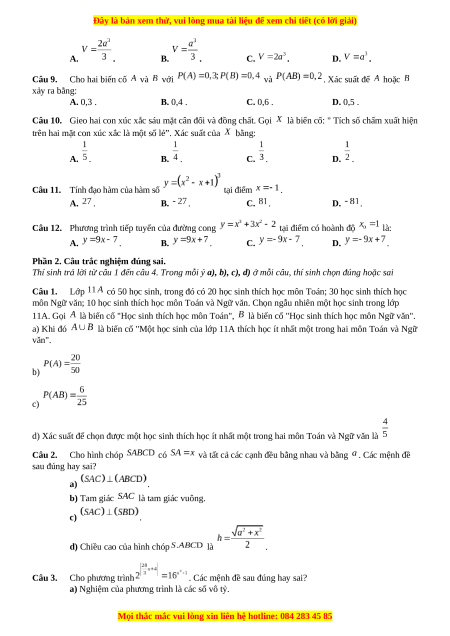 thích môn Ngữ văn hoặc môn Toán. Câu 3. Cho hình chóp
