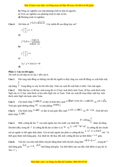 d) Phương trình vô nghiệm. Câu 4. Xét hàm số