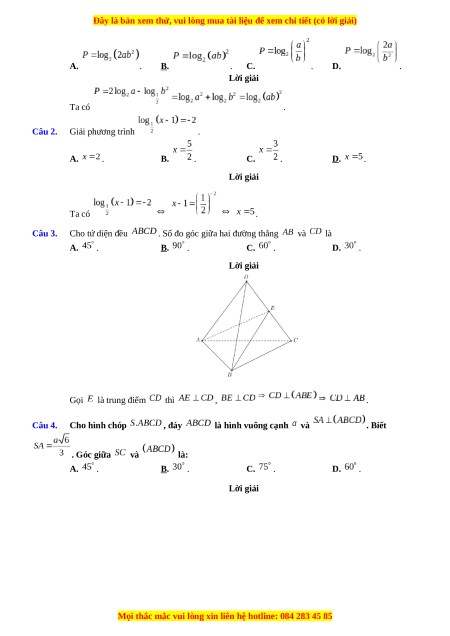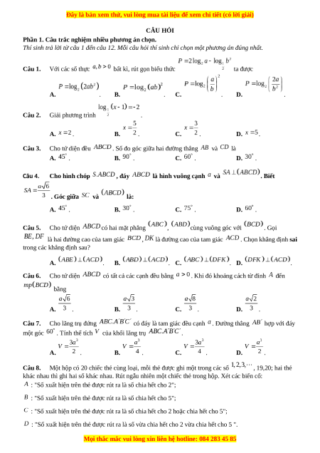 bất kì, rút gọn biểu thức ta được A. . B. . C. . D. . Câu 2. Giải phương trình . A. . B. . C. . D. . Câu 3. Cho tứ diện đều