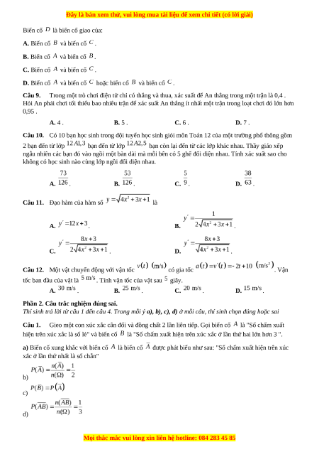 D. Biến cố và biến cố hoặc biến cố và biến cố . Câu 9.