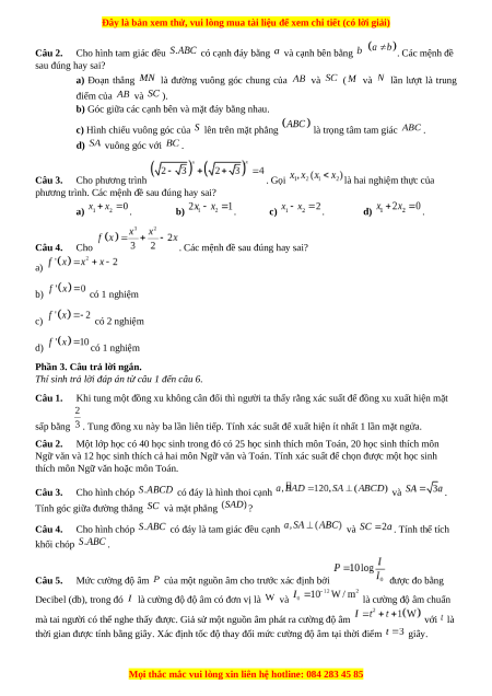 c) Hình chiếu vuông góc của lên trên mặt phẳng là trọng tâm tam giác . d) vuông góc với . Câu 3. Cho phương trình . Gọi là hai nghiệm thực của