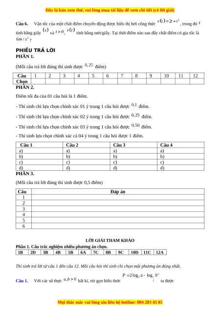 tính bằng mét/giây. Tại thời điểm nào sau đây chất điểm có gia tốc là ? PHIẾU TRẢ LỜI PHẦN 1.