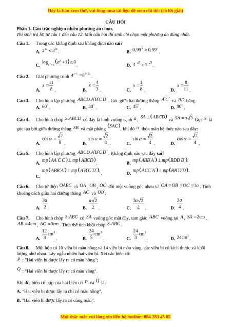 Trong các khẳng định sau khẳng định nào sai? A. . B. . C. . D. < . Câu 2. Giải phương trình . A. . B. . C. . D. . Câu 3. Cho hình lập phương