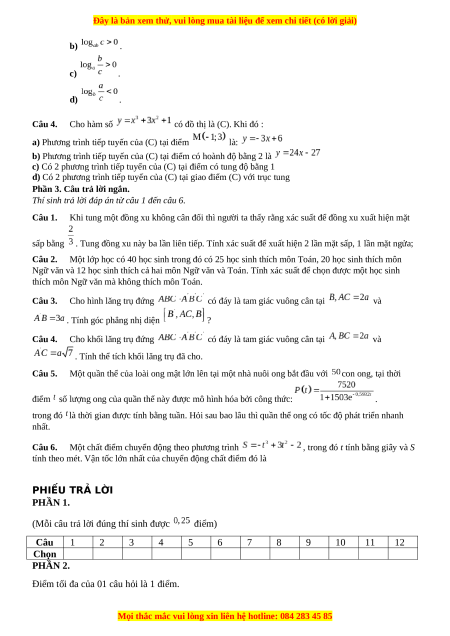 Thí sinh trả lời đáp án từ câu 1 đến câu 6. Câu 1.