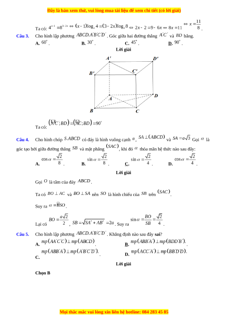 , khi đó thỏa mãn hệ thức nào sau đây: A. . B. . C. . D. . Câu 5. Cho hình lập phương