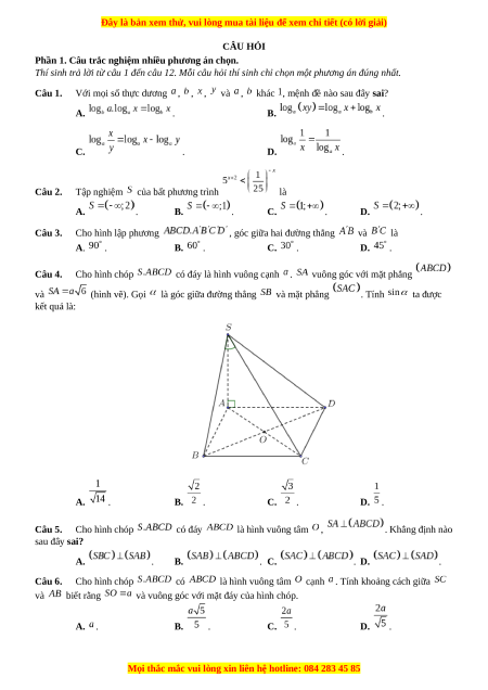 Thí sinh trả lời từ câu 1 đến câu 12. Mỗi câu hỏi thí sinh chỉ chọn một phương án đúng nhất. Câu 1.