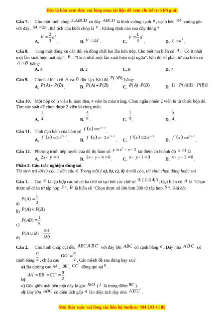, thể tích của khối chóp là . Khẳng định nào sau đây đúng ? A. . B. . C. . D. . Câu 8.