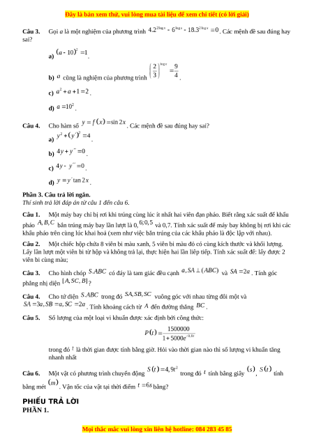 Thí sinh trả lời đáp án từ câu 1 đến câu 6. Câu 1.