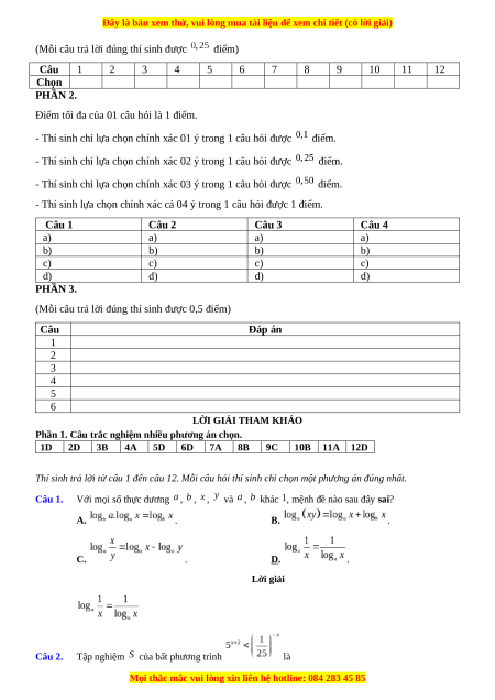 Phần 1. Câu trắc nghiệm nhiều phương án chọn. 1D 2D 3B 4A 5D 6D 7A 8B 9C 10B 11A 12D