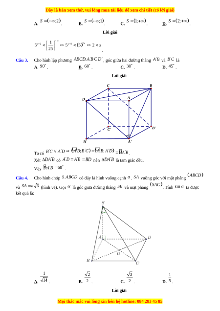 Tập nghiệm của bất phương trình là A. . B. . C. . D. . Câu 3. Cho hình lập phương