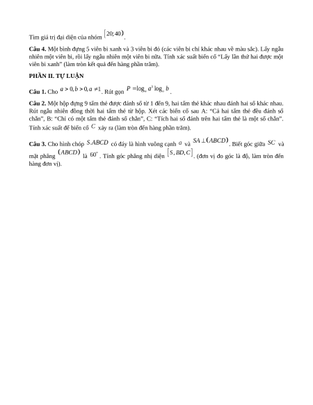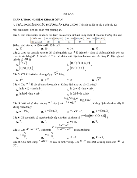 Câu 3. Với là số thực dương tùy ý, bằng A. . B. . C. . D. . Câu 4. Cho