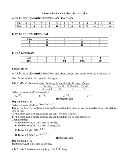 Câu 1. Mẫu số liệu sau cho biết cân nặng của học sinh lớp 12 trong một lớp