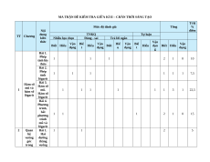MA TRẬN ĐỀ KIỂM TRA GIỮA KÌ II – CHÂN TRỜI SÁNG TẠO Tỉ lệ Mức độ đánh giá Tổng % Nội điểm dung TNKQ Tự luận TT Chương kiến Nhiều lựa chọn Đúng - sai Trả lời ngắn thức Vận Vận Biế Vận Hiể Vận Biế Vận Biết Hiểu Hiểu Biết Hiểu dụn Biết Hiểu dụng t dụng u dụng t dụng g Bài 1. Phép 1 1 1 2 1 0 10 tính lũy thừa Bài 2. Phép 1 1 1 1 1 1 7,5 tính lôgarit Bài 3. Hàm số Hàm số mũ và 1 mũ. 1 1 1 1 1 1 3 1 22,5 hàm số Hàm số lôgarit lôgarit Bài 4. Phương trình, bất 1 1 1 2 1 0 15 phương trình mũ và lôgarit 2 Quan Bài 1. 1 1 2 5 hệ Hai vuông đường góc thẳng trong vuông góc Bài 2. Đường thẳng vuông 1 1 1 1 1 2 1 2 22,5 góc với không mặt gian phẳng Bài 3. Hai mặt 1 1 1 2 1 2 3 1 17,5 phẳng vuông góc Tổng số câu 6 4 2 3 5 0 2 1 1 1 0 2 11 11 5 Tổng số điểm 3,0 2,0 2,0 3,0 4,0 3,0 3,0 10 Tỉ lệ % 30 20 20 30 40 30 30 100 Lưu ý: