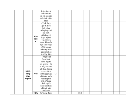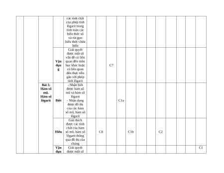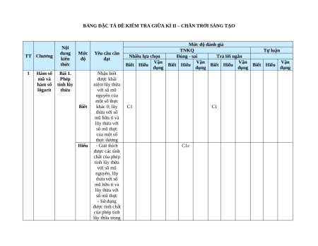 BẢNG ĐẶC TẢ ĐỀ KIỂM TRA GIỮA KÌ II – CHÂN TRỜI SÁNG TẠO Mức độ đánh giá Nội TNKQ Tự luận dung Mức Yêu cầu cần TT Chương kiến độ đạt Nhiều lựa chọn Đúng - sai Trả lời ngắn thức Vận Vận Vận Vận Biết Hiểu Biết Hiểu Biết Hiểu Biết Hiểu dụng dụng dụng dụng 1 Hàm số Bài 1. Nhận biết mũ và Phép được khái hàm số tính lũy niệm lũy thừa lôgarit thừa với số mũ nguyên của một số thực Biết khác 0; lũy C1 C1 thừa với số mũ hữu tỉ và lũy thừa với số mũ thực của một số thực dương Hiểu - Giải thích C1c được các tính chất của phép tính lũy thừa với số mũ nguyên, lũy thừa với số mũ hữu tỉ và lũy thừa với số mũ thực - Sử dụng được tính chất của phép tính lũy thừa trong tính toán các biểu thức số và rút gọn các biểu thức chứa biến - Tính được giá trị biểu thức số có chứa phép tính lũy thừa - Giải quyết Vận được một số dụn vấn đề liên g quan đến môn học khác hoặc có liên quan đến thực tiễn gắn với phép tính lũy thừa - Nhận biết được khái niệm lôgarit cơ số a (a > 0, a ) của một số thực dương Bài 2. - Giải thích Phép Biết được các tính C2 tính chất của phép lôgarit tính lôgarit nhờ sử dụng định nghĩa hoặc các tính chất đã biết trước đó Hiểu Sử dụng được C1d