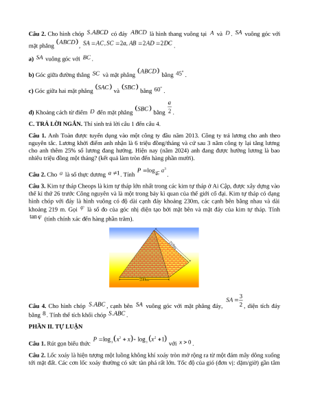C. TRẢ LỜI NGẮN. Thí sinh trả lời câu 1 đến câu 4.