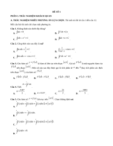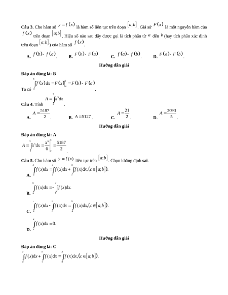 . Hiệu số nào sau đây được gọi là tích phân từ đến (hay tích phân xác định trên đoạn ) của hàm số . A. . B. . C. . D. . Câu 4. Tính . A. . B. . C. . D. . Câu 5. Cho hàm số liên tục trên