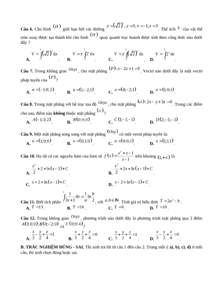 B. TRẮC NGHIỆM ĐÚNG - SAI. Thí sinh trả lời từ câu 1 đến câu 2. Trong mỗi ý a), b), c), d) ở mỗi