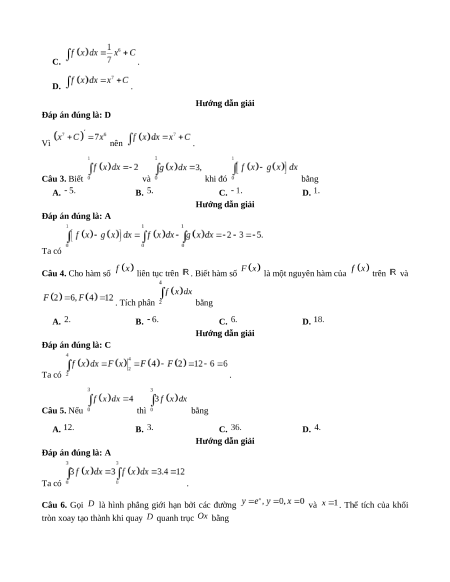 liên tục trên . Biết hàm số là một nguyên hàm của trên và . Tích phân bằng A. B. C. D. Câu 5. Nếu thì bằng A. B. C. D.