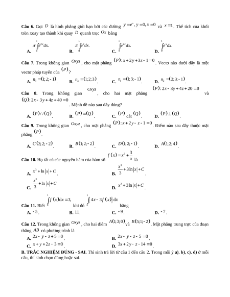 Câu 6. Gọi là hình phẳng giới hạn bởi các đường và . Thể tích của khối