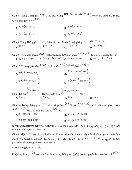 , mặt phẳng đi qua điểm và song song với mặt phẳng có dạng . Tính . PHẦN II. TỰ LUẬN Câu 1. Cho trong đó