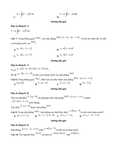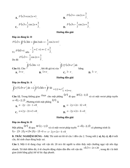 Câu 10. Tìm nguyên hàm của hàm số , biết . A. . B. . C. . D. . Câu 11. Cho , khi đó giá trị của bằng A. . B. . C. . D. .