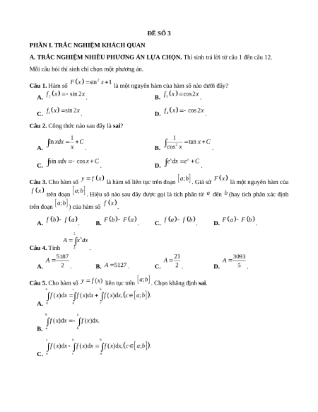 Câu 2. Công thức nào sau đây là sai? A. . B. . C. . D. . Câu 3. Cho hàm số