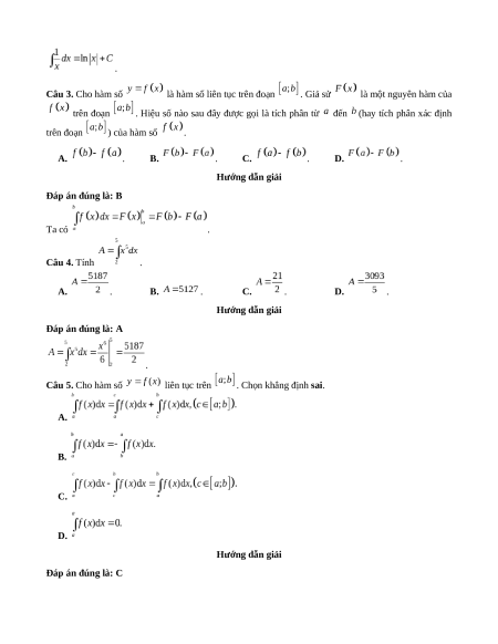 . Hiệu số nào sau đây được gọi là tích phân từ đến (hay tích phân xác định trên đoạn ) của hàm số . A. . B. . C. . D. . Câu 4. Tính . A. . B. . C. . D. . Câu 5. Cho hàm số liên tục trên