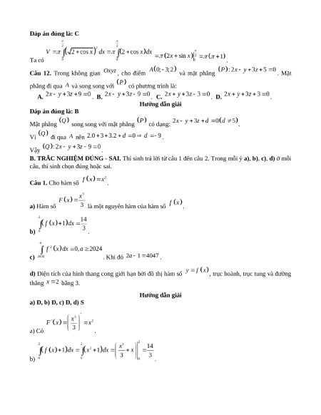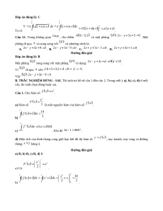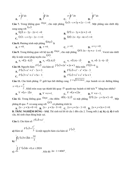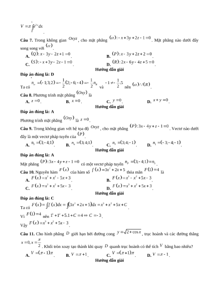 đây là một vectơ pháp tuyến của . A. . B. . C. . D. . Câu 10. Nguyên hàm của hàm số thỏa mãn là A. . B. . C. . D. .
