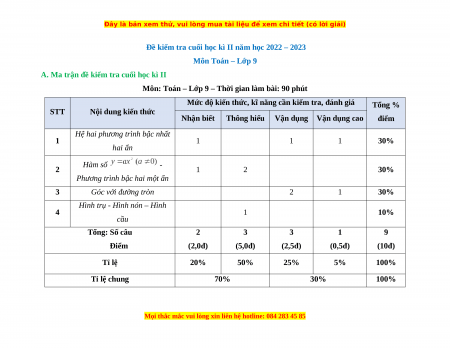 Đề kiểm tra cuối học kì II năm học 2022 – 2023 Môn Toán – Lớp 9