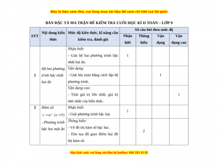BẢN ĐẶC TẢ MA TRẬN ĐỀ KIỂM TRA CUỐI HỌC KÌ II TOÁN – LỚP 9