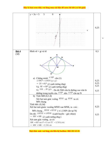y = 3x + 5 5 0 8 6 5 4 0,25 2 x 15 10 5 5 10 15 O 2 x 4 6 Bài 4 Hình vẽ + gt và kl 0,5 (3đ) N H K I P M D a) Chứng minh cân (1) 0,25 (2 cạnh tương ứng) 0,25 Và (2 cạnh tương ứng) 0,25 Vì