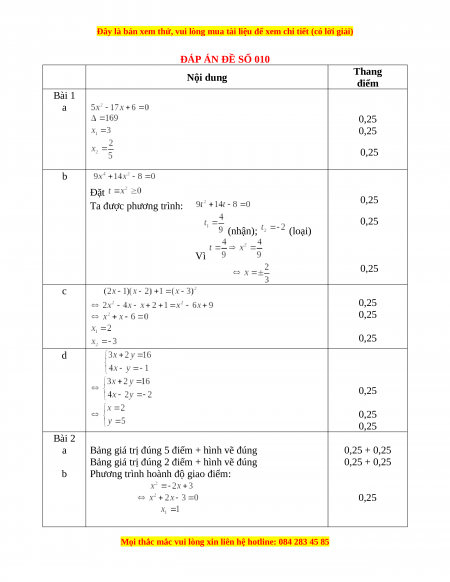 ĐÁP ÁN ĐỀ SỐ 010 Thang Nội dung điểm Bài 1 a 0,25 0,25 0,25 b Đặt 0,25 Ta được phương trình: 0,25 (nhận); (loại) Vì 0,25 c 0,25 0,25 0,25 d 0,25 0,25 0,25 Bài 2 a