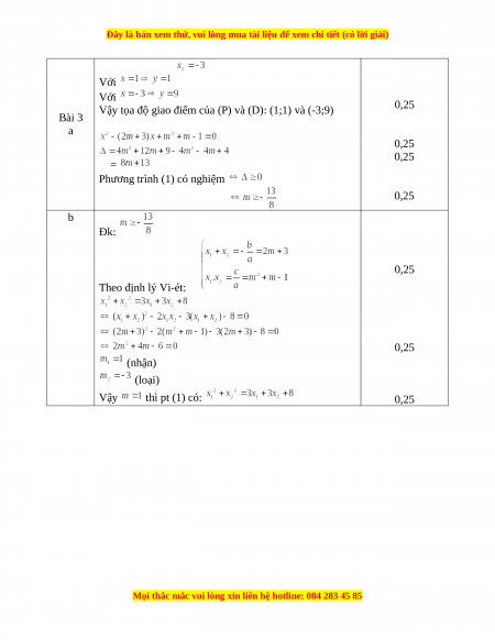 Vậy tọa độ giao điểm của (P) và (D): (1;1) và (-3;9) 0,25 Bài 3 a 0,25 0,25 =