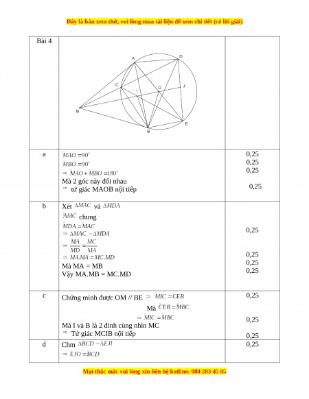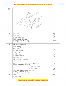 Bài 4 a 0,25 0,25 0,25 Mà 2 góc này đối nhau tứ giác MAOB nội tiếp 0,25 b Xét và chung 0,25 0,25 Mà MA = MB 0,25 Vậy MA.MB = MC.MD 0,25 c