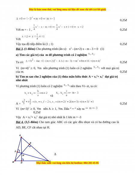 Bài 3. (1 điểm) Cho phương trình (ẩn x): x2 - (m+2) x - m - 3 = 0 (1), m là tham số