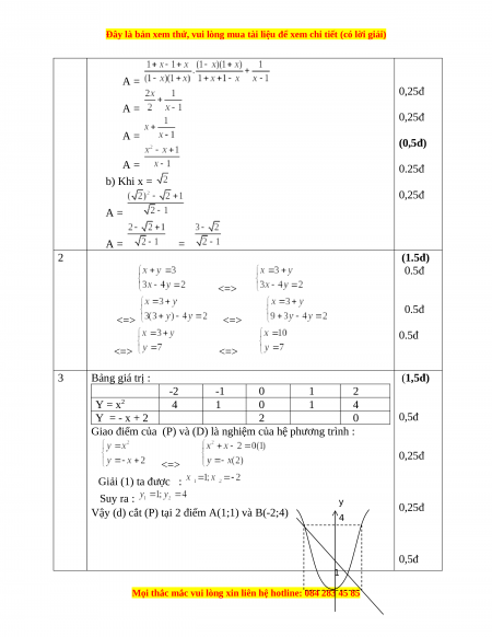 A = 0,25đ A = 0,25đ A = (0,5đ) A = 0.25đ b) Khi x = 0,25đ A = A = = 2 (1.5đ) 0.5đ <=> 0.5đ <=> <=> 0.5đ <=> <=> 3 Bảng giá trị : (1,5đ) -2 -1 0 1 2 Y = x2 4 1 0 1 4 Y = - x + 2 2 0 0,5đ