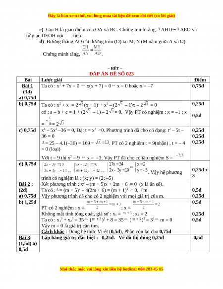ĐÁP ÁN ĐỀ SỐ 023 Bài Lược giải Điểm Bài 1 Ta có : x2 + 7x = 0 x(x + 7) = 0 x = 0 hoặc x = –7 0,75đ (3đ) a) 0,75đ