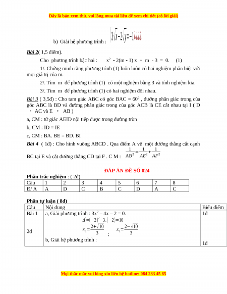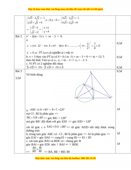 c. Vì PT có 2 nghiệm đối nhau 0,5đ Bài 3 B 0,5đ Vẽ hình đúng 3,5đ E I C A D a, 1đ