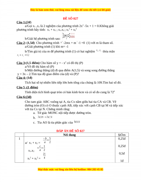 ĐÁP ÁN ĐỀ SỐ 027 Néi dung §iÓm 1 −b 5 0,25đ = a/ x a 2 1 + x2 = c 1 0,25đ = = x a 2 1.x2 21 0,5đ 2 2 4 x1 + x2 = 1đ