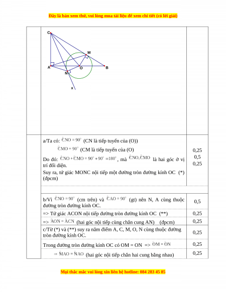 c/Từ (*) và (**) suy ra năm điểm A, C, M, O, N cùng thuộc đường 0,25 tròn đường kính OC.