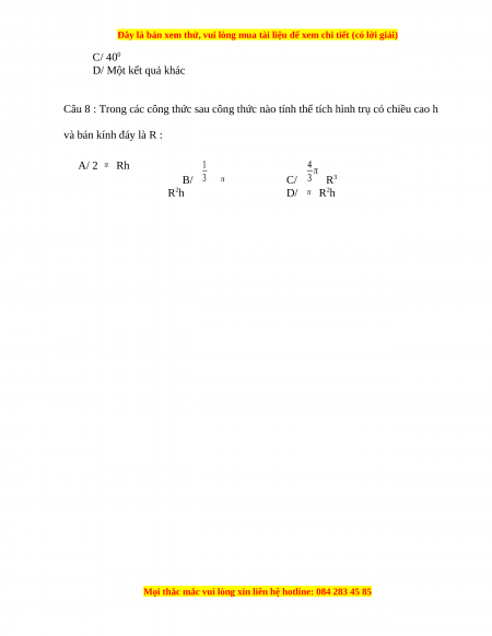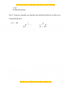 Câu 8 : Trong các công thức sau công thức nào tính thể tích hình trụ có chiều cao h