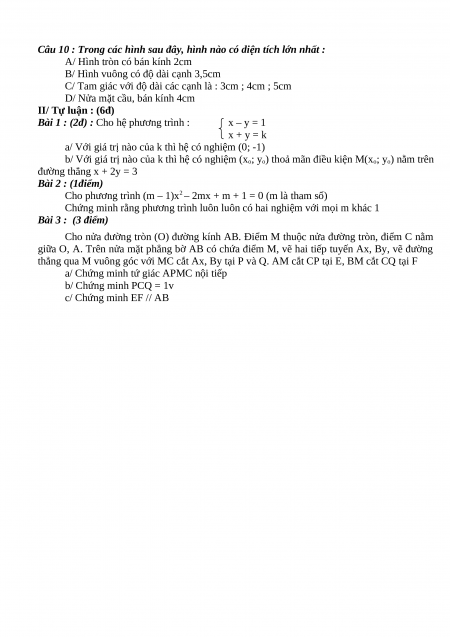 D/ Nửa mặt cầu, bán kính 4cm II/ Tự luận : (6đ)