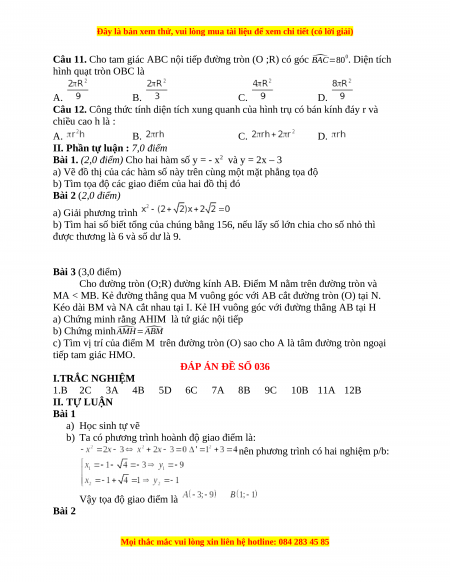 ĐÁP ÁN ĐỀ SỐ 036 I.TRẮC NGHIỆM 1.B 2C 3A 4B 5D 6C 7A 8B 9C 10B 11A 12B II. TỰ LUẬN Bài 1 a) Học sinh tự vẽ