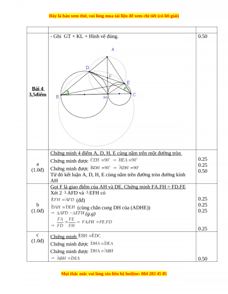 (cùng chắn cung DH của (ADHE)) (1.0đ) 0.25 (g.g) 0.25 c Chứng minh (1.0đ) Chứng minh được Chứng minh được 0.50