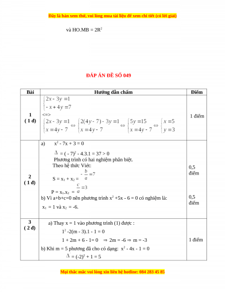 ĐÁP ÁN ĐỀ SỐ 049 Bài Hướng dẫn chấm Điểm 1 <=> 1 điểm ( 1 đ) a) x2 - 7x + 3 = 0 = ( - 7)2 - 4.3.1 = 37 > 0