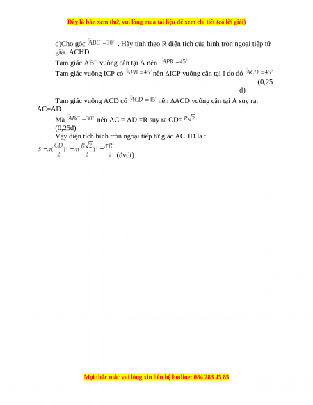nên ACD vuông cân tại A suy ra: AC=AD Mà nên AC = AD =R suy ra CD= (0,25đ)
