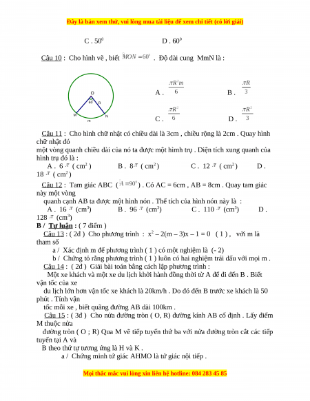 Câu 10 : Cho hình vẽ , biết . Độ dài cung MmN là : O A . B . 60 R M N m C . D .