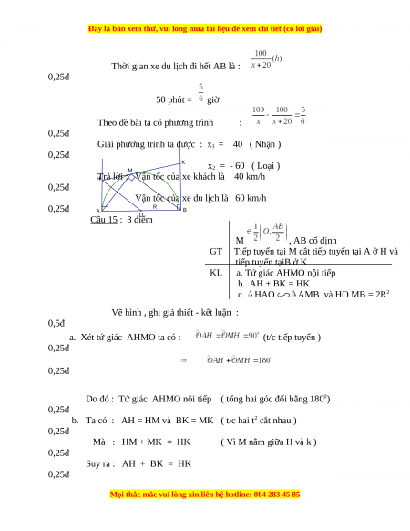 Vận tốc của xe du lịch là 60 km/h R 0,25đ A B O Câu 15 : 3 điểm M , AB cố định